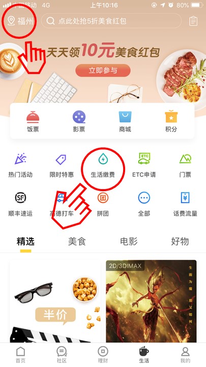 10、返回首頁后點擊下方“生活”頻道中“生活繳費”按鈕(定位選擇“福州”)