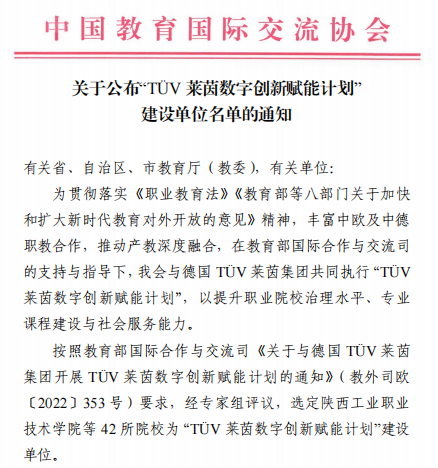 2023年3月14日,中國教育國際交流協(xié)會(huì)公布了“TüV萊茵數(shù)字創(chuàng)新賦能計(jì)劃”建設(shè)單位名單。我校成為建設(shè)單位之一,新能源技術(shù)專業(yè)群被確立為建設(shè)專業(yè),在獲批名單內(nèi)排名第五。