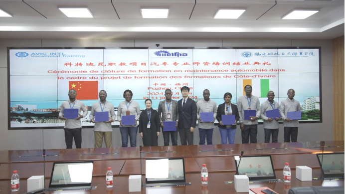 會上,陳艷紅副院長以及張航經(jīng)理向科特迪瓦學員頒發(fā)了結業(yè)證書并留影,科特迪瓦職教項目督學科菲·古阿古·荷內向汽車學院贈送了禮物表示感謝。